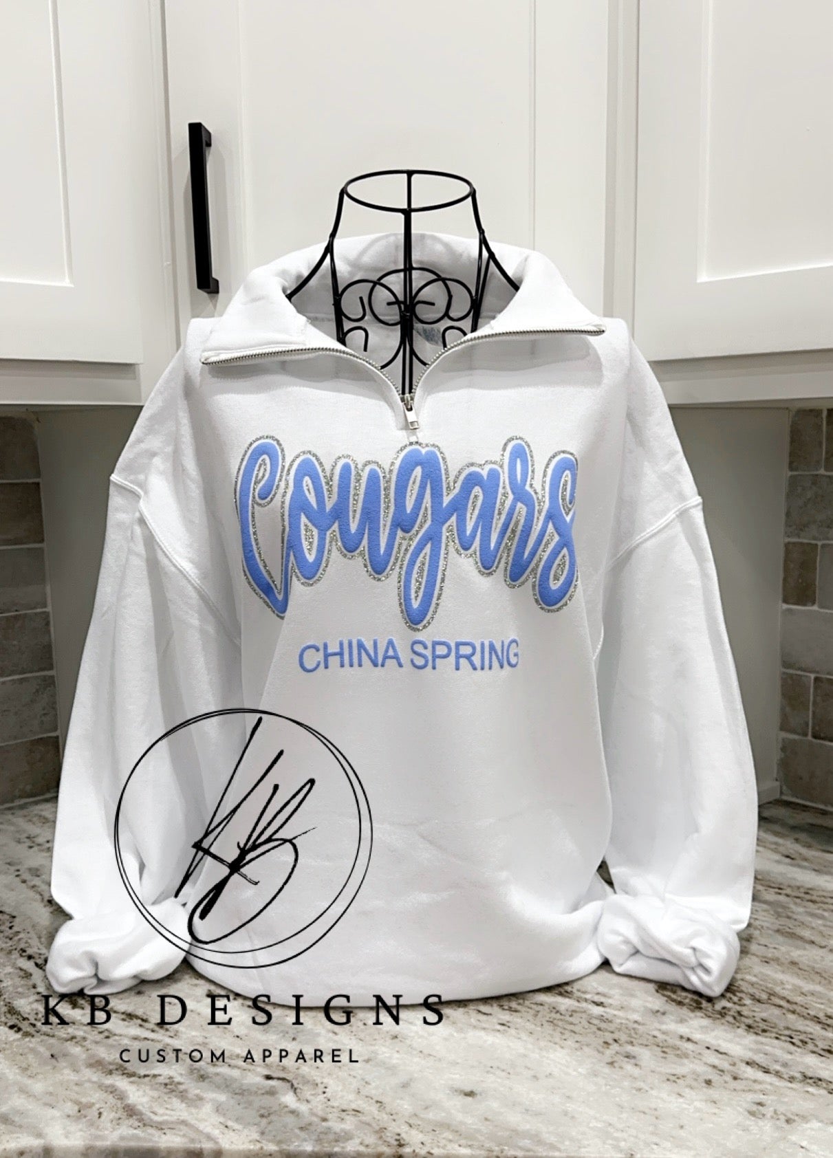 The 1/4 pullover is made with HTV glitter outline, and HTV Puff words. The pull over is Jerzee brand that fits true to size.